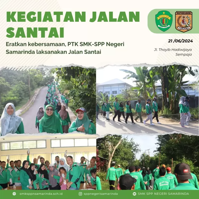 Hari ini (21/06) SMK-SPP Negeri Samarinda melaksanakan kegiatan Jalan Santai diikuti oleh seluruh PTK. Kegiatan diawali dengan pemanasan bertempat di halaman sekolah dan berdoa. Rute jalan santai kali ini Jl. Thayib Hadiwidjaya- Gg. Ahim- Jl. PM Noor- memasuki area lahan praktik siswa dan kembali ke sekolah. Acara dilanjutkan dengan makan bubur kacang hijau bersama dan pembagian doorprize.