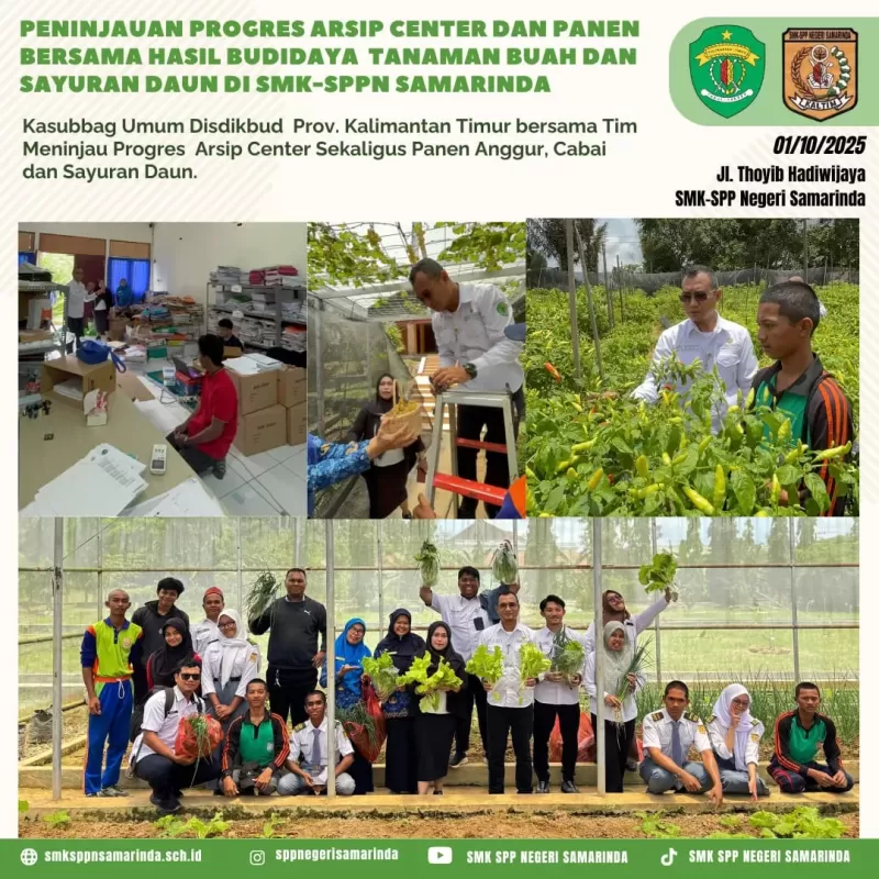 Samarinda (01/10) Kasubag Umum Disdikbud Prov Kalimantan Timur Bapak Bambang Hadiyanto bersama tim melakukan peninjauan progres arsip center dan panen bersama hasil budidaya tanaman buah dan sayuran daun di SMK-SPP Negeri Samarinda. Tentunya peninjauan ini disambut penuh semangat oleh Kepala Sekolah ibu Elis Susiana, S. Pd., M. Pd. Beserta PTK SMK SPP Negeri Samarinda