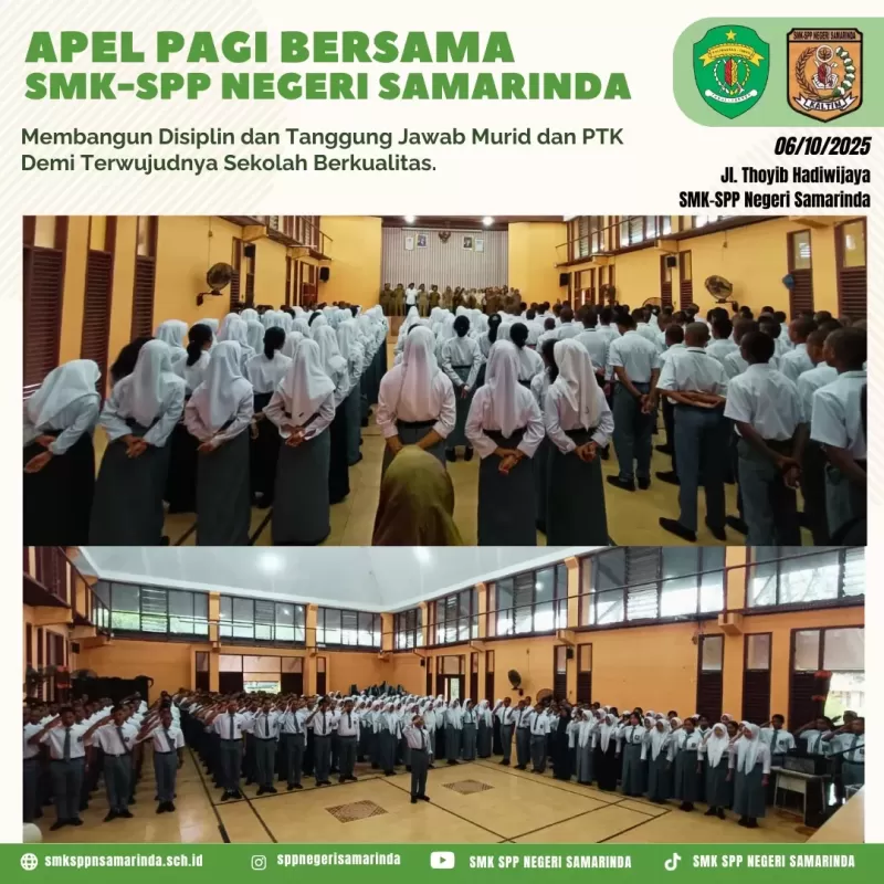 Senin (06/10) SMK-SPP Negeri Samarinda melakukan apel pagi bersama yang dihadiri oleh seluruh kelas X dan XI serta PTK SMK-SPP Negeri Samarinda.
