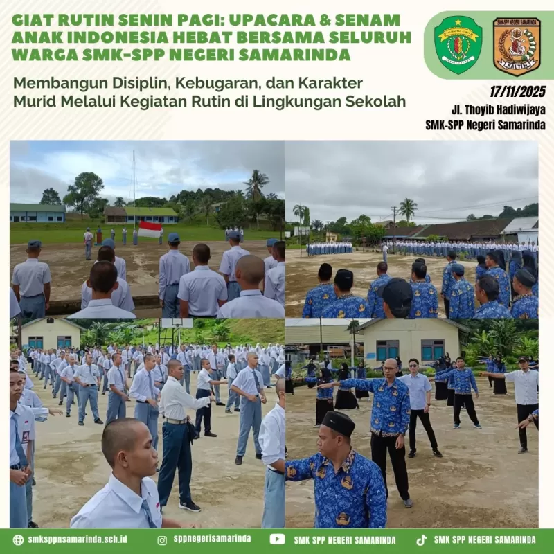 Senin (17/11/2025) SMK-SPP Negeri Samarinda berpadu dalam kebersamaan, khidmat saat Upacara yang dilaksanakan oleh seluruh GTK dan Murid kelas X dan XI. upacara bendera bukan sekadar kegiatan rutin, tetapi merupakan media pendidikan yang efektif untuk membentuk murid yang disiplin dan berkarakter.