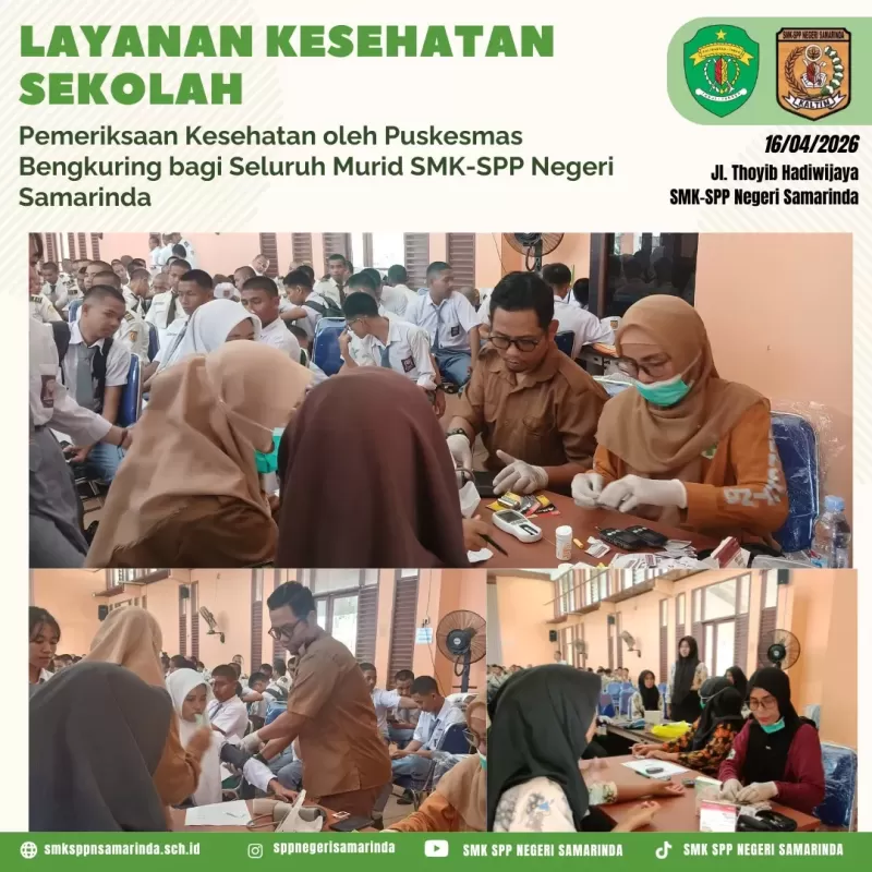 Samarinda (16/04/2026) SMK-SPP Negeri Samarinda bekerja sama dengan Puskesmas Bengkuring melaksanakan pemeriksaan kesehatan berkala bagi seluruh murid. Mulai dari pengecekan tinggi & berat badan, kesehatan gigi, hingga pemeriksaan umum lainnya.