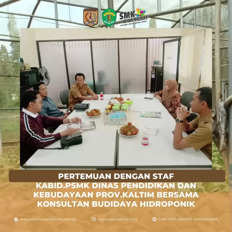 Pertemuan Kepala Sekolah Bu Elis Susiana, S. Pd, M.Pd Kolaborasi dengan staf Kabid Pembinaan SMK Dinas Pendidikan dan Kebudayaan Provinsi Kaltim serta konsultan budidaya hidroponik akan menjadi langkah penting dalam perencanaan dan implementasi proyek tersebut, ini menunjukkan komitmen SMK-SPP Negeri Samarinda untuk mengembangkan budidaya hidroponik melalui pemanfaatan Screen House. Semoga kerjasama ini berjalan lancar dan memberikan manfaat positif bagi pendidikan dan pengembangan pertanian sekolah mungkin tidak hanya di sekolah tetapi di Kaltim maupun di seluruh Indonesia.