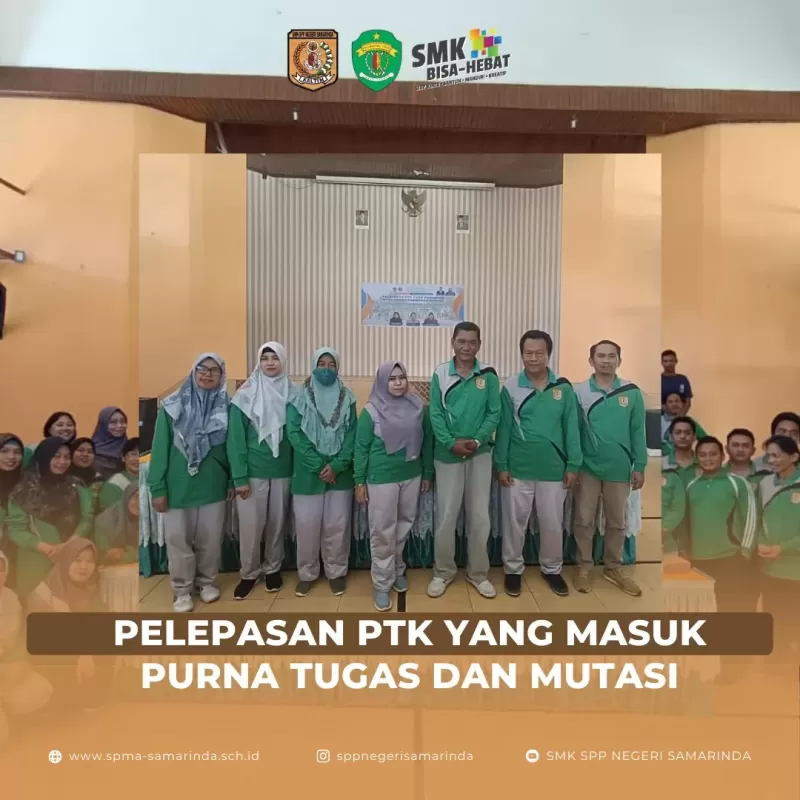 Jumat (26/01) SMK-SPP Negeri Samarinda mengadakan pelepasan PTK yang memasuki Purna Tugas dan Mutasi. Ibu Ir. Masrudah, S.E., M.Pd. dan Bapak Mustiadi, S.P. telah memasuki masa purnatugas atau pensiun terhitung tanggal 1 Februari 2024. Ibu Masrudah merupakan guru produktif dan Analis Laboratorium Pendidikan telah mengabdi selama 28 tahun dan Pak Mustiadi merupakan guru produktif dan Ketua Prodi ATP telah mengabdi kurang lebih 19 tahun di SMK-SPP Negeri Samarinda. Pelepasan PTK mutasi, Ibu Isna Mulyati, S.Ag. selaku Analis Pelaporan & Transaksi Keuangan akan ditugaskan di Dinas Pendidikan Provinsi Kalimantan Timur.