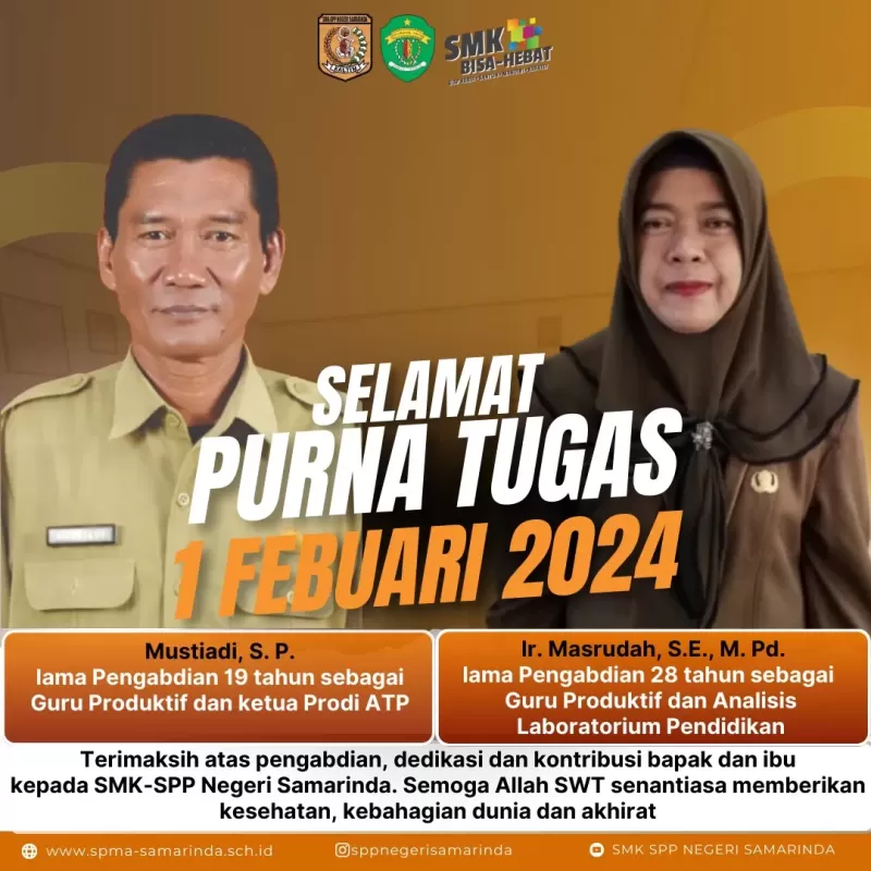 Selamat Purna Tugas Ibu Masrudah, S.E., M. Pd. dan Bapak Mustiadi, S.P. telah memasuki masa purna tugas atau pensiun terhitung tanggal 1 Februari 2024.