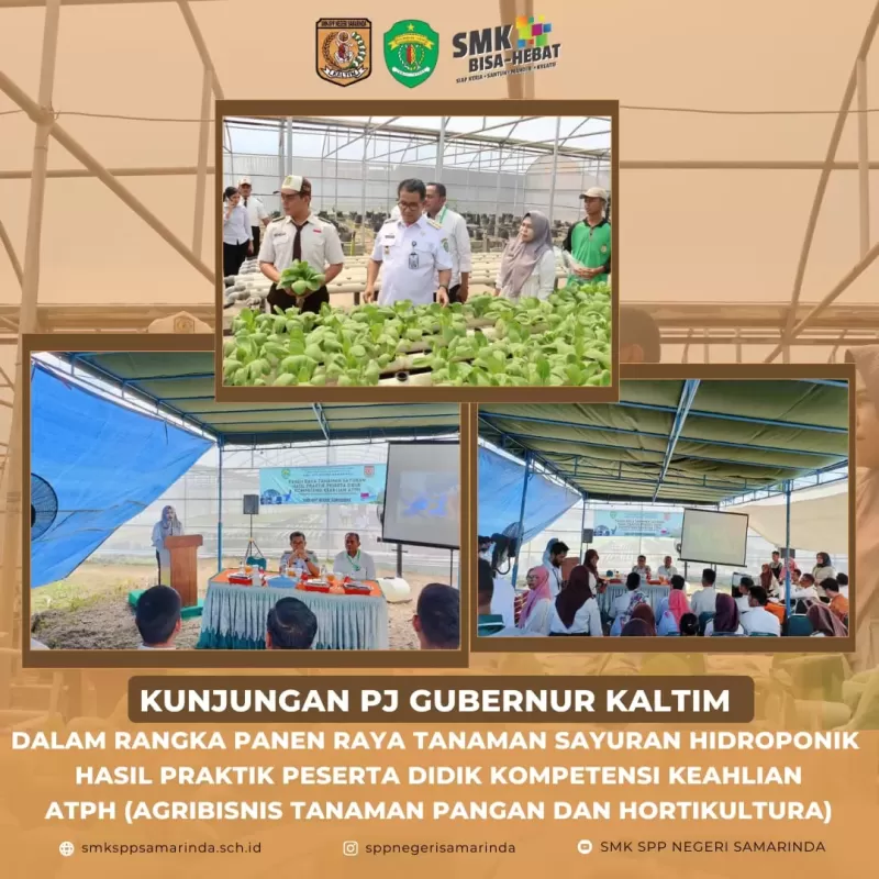 Penjabat (Pj) Gubernur Kalimantan Timur, Bapak Dr. Akmal Malik, M.Si menghadiri panen raya tanaman hidroponik di Green House SMK-SPP Negeri Samarinda pada Rabu (28/02). Tanaman sayuran hidroponik yang dipanen merupakan hasil praktik peserta didik Agribisnis Tanaman Pangan dan Hortikultura (ATPH).