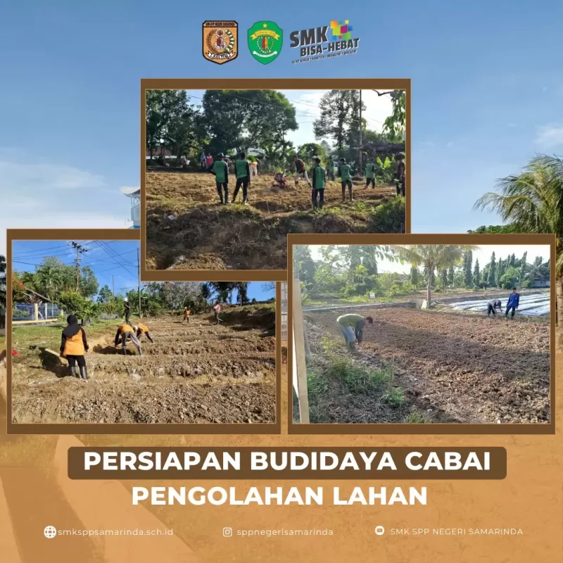 Praktik peserta didik pengolahan lahan untuk persiapan penanaman tanaman cabai. Sebelum ditanam, tanah sebelum harus dilakukan pengolahan tanah dari menggemburkan tanah dengan bantuan traktor, membentuk bedengan serta pemberian kapur dan pupuk kandang. Setelah dilakukan pengolahan tanah maka selanjutnya pemasangan Mulsa untuk menenangkan pertumbuhan gulma/rumput dan menjaga tanah agar tetap lembab