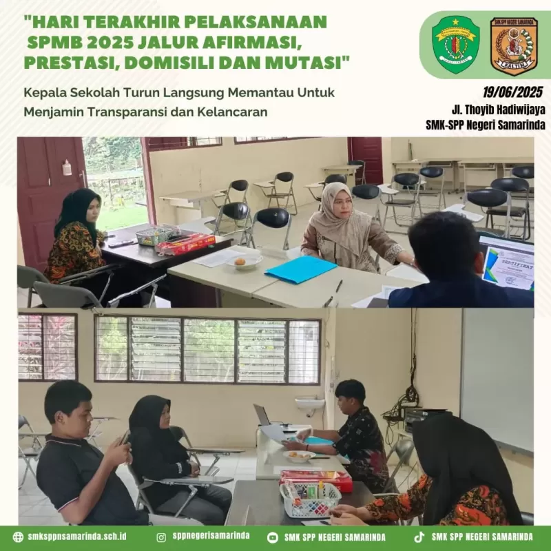 Kamis (19/06) Hari Terakhir Pelaksanaan SPMB Tahun 2025 jalur domisili prioritas, afirmasi, prestasi dan mutasi di SMK-SPP Negeri Samarinda. Adapun giat ini Kepala Sekolah, Ibu Elis Susiana, S.Pd., M.Pd., memonitoring langsung ke lapangan untuk memastikan proses berjalan lancar, transparan, dan berintegritas tinggi. SMK-SPP Negeri Samarinda memberikan kesempatan kepada calon murid baru untuk bergabung dan mengembangkan potensi mereka. Semoga proses ini membawa hasil yang terbaik bagi SMK-SPP Negeri Samarinda dan menjadi langkah awal bagi generasi baru untuk mencapai kesuksesan