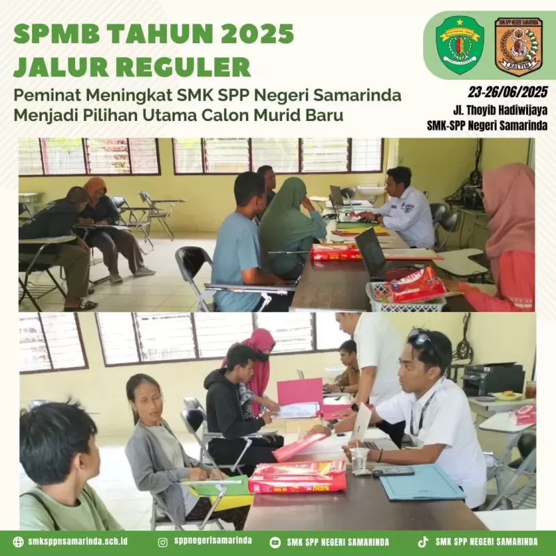 Kamis (26/06) SPMB 2025 Jalur Reguler berjalan dengan lancar, SMK-SPP Negeri Samarinda menjadi pilihan utama Peminat meningkat. kesempatan emas untuk menjadi bagian dari sekolah unggulan yang mencetak generasi penerus bangsa. Siapkah untuk mengukir prestasi, mengembangkan bakat, dan membangun masa depan ☀ Mari bergabung dengan keluarga besar SMK-SPP Negeri Samarinda dan wujudkan impianmu
