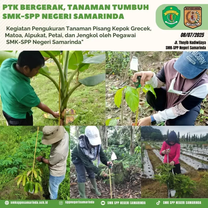 PTK Bergerak, Tanaman Tumbuh ☘️ Selasa (08/07) SMK-SPP Negeri Samarinda melaksanakan kegiatan pengukuran tanaman pisang kepok grecek, matoa, alpukat, petai, dan jengkol. Kegiatan ini dilakukan oleh PTK SMK-SPP Negeri Samarinda untuk memantau pertumbuhan dan perkembangan tanaman, serta meningkatkan keterampilan dan pengetahuan dalam bidang pertanian.