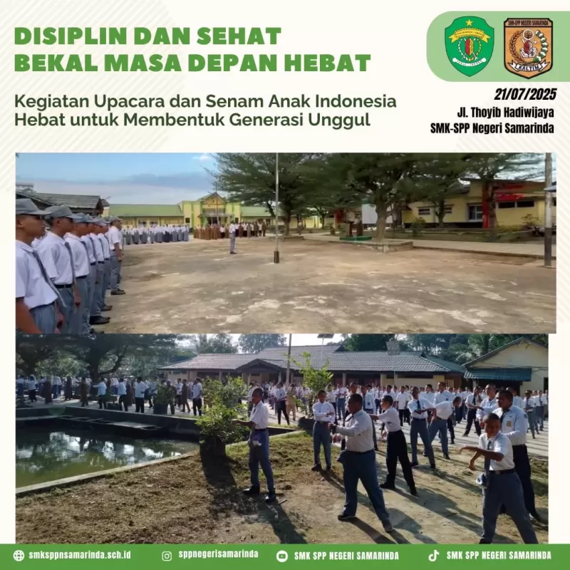 Senin (21/07) Kegiatan Upacara dan Senam Anak Indonesia Hebat menjadi langkah penting dalam membentuk generasi unggul yang berkarakter, disiplin, dan sehat. Pembina upacara hari ini ibu Elis Susiana, S. Pd., M. Pd. Dalam amanatnya beliau mengucapkan selamat atas keberhasilan murid SMK-SPP yang mewakili kaltim untuk maju ke tingkat nasional lomba kompetensi siswa (LKS) pada mata lomba landscape dan gardening tentunya dengan kolaborasi dan sinergitas tim yang solid yaitu guru mapel dan tendik yang membimbing murid-murid sehingga sampai pada tahap ini. Dengan prestasi yang diraih diharapkan murid yang lain dapat menjadikan contoh dan inspirasi untuk menggapai prestasi.