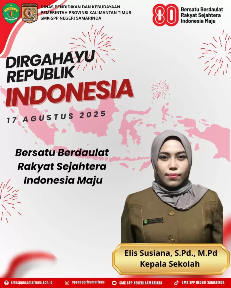 SMK SPP Negeri Samarinda mengucapkan selamat Hari Ulang Tahun ke-80 Republik Indonesia 2025. Semoga semangat persatuan senantiasa memperkokoh langkah kita menuju Indonesia Maju. Tentunya semangat kemerdekaan ini akan terus membara dan menginspirasi kita semua untuk menjadi generasi yang tangguh dan berprestasi. Mari wujudkan Indonesia yang adil, berdaulat, dan makmur ✨🇮🇩