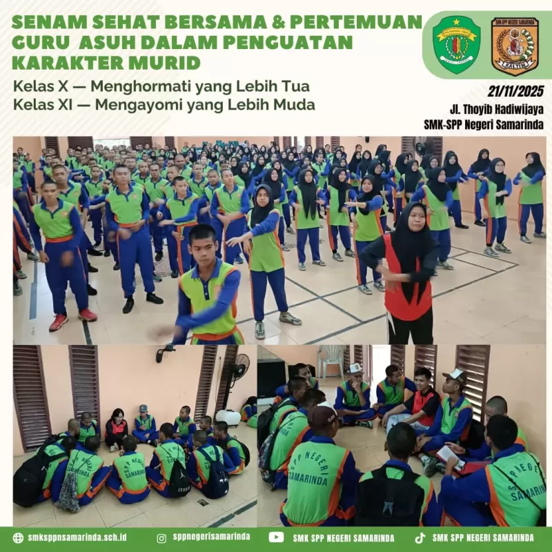 Jumat (21/11/2025) SMK-SPP Negeri Samarinda mengawali pagi ini dengan penuh energi. Diawali dengan Senam Sehat Anak Indonesia Hebat, untuk tubuh yang bugar senam ini diikuti oleh seluruh kelas X dan XI serta didampingi oleh GTK SMK-SPP Negeri Samarinda. Setelah itu dilanjutkan dengan Pertemuan Guru Wali dan murid asuh dalam rangka Penguatan Karakter Murid.