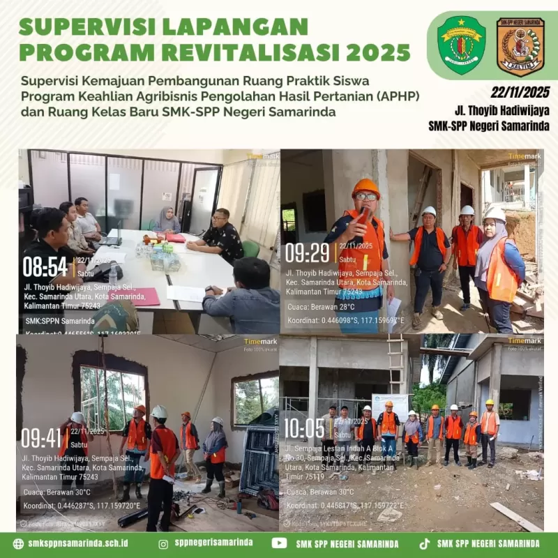 Samarinda (22/11/2025) – Telah dilaksanakan supervisi bantuan Revitalisasi di SMK-SPP Negeri Samarinda oleh Kementrian Dasar dan Menengah terhadap pembangunan Ruang Praktik Siswa Program Keahlian APHP dan Ruang Kelas Baru. Kegiatan ini disambut oleh Kepala Sekolah, Ibu Elis Susiana, S.Pd., M.Pd., bersama tim P2SP.