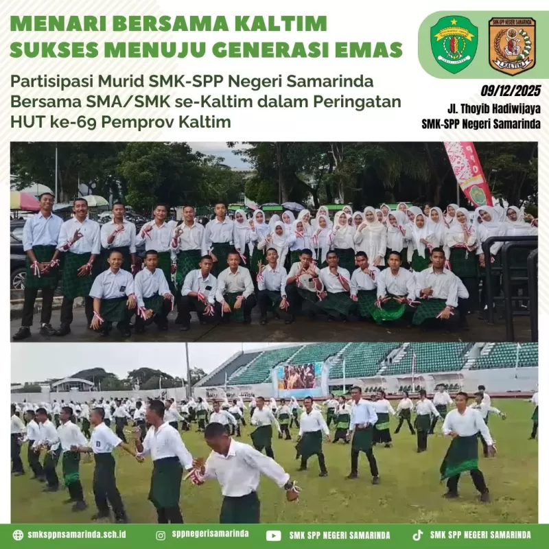 Jumat (09/01/2026) Dalam rangka memeriahkan hari jadi ke-69 Pemerintah Provinsi Kalimantan Timur, sebanyak 50 murid dan 2 Guru Pendamping SMK-SPP Negeri Samarinda turut serta dalam atraksi kolosal "Menari Bersama Kaltim". Kegiatan ini menjadi simbol sinergi dan semangat kolektif murid SMA/SMK se-Kalimantan Timur untuk mewujudkan Generasi Emas.