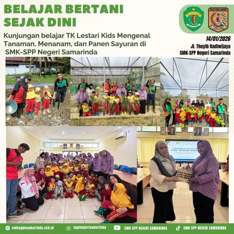 Kepala Sekolah TK Lestari Kids Ibu Dede Novianti dalam sambutannya mengucapkan terimakasih kepada Kepala Sekolah dan Guru-guru SMK-SPP Negeri Samarinda bahwa sudah menerima kunjungan dari TK Lestari Kids. Murid dapat mengenal tanaman sayuran dan memanen sendiri. Semoga pembelajaran hari ini dapat bermanfaat untuk kami serta ilmu yang didapatkan akan dipraktekkan di rumah.
