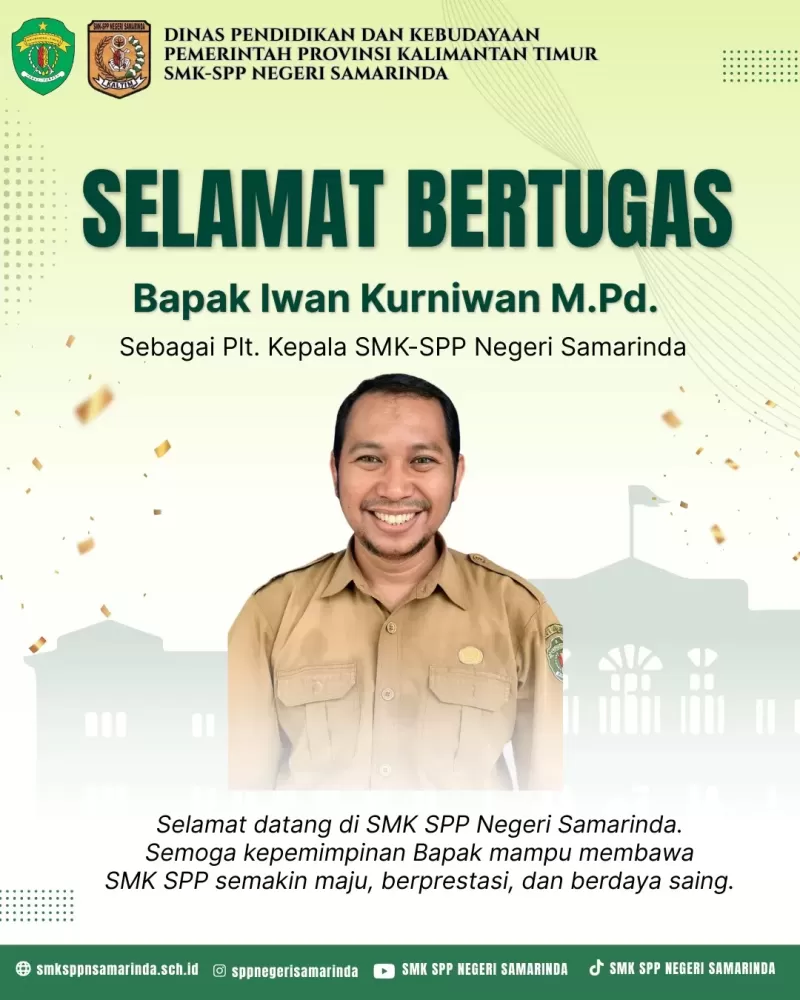 Keluarga besar SMK-SPP Negeri Samarinda mengucapkan selamat datang dan selamat bertugas kepada Bapak Iwan Kurniawan, M. Pd. yang kini resmi menjabat sebagai Plt. Kepala Sekolah SMK-SPP Negeri Samarinda.