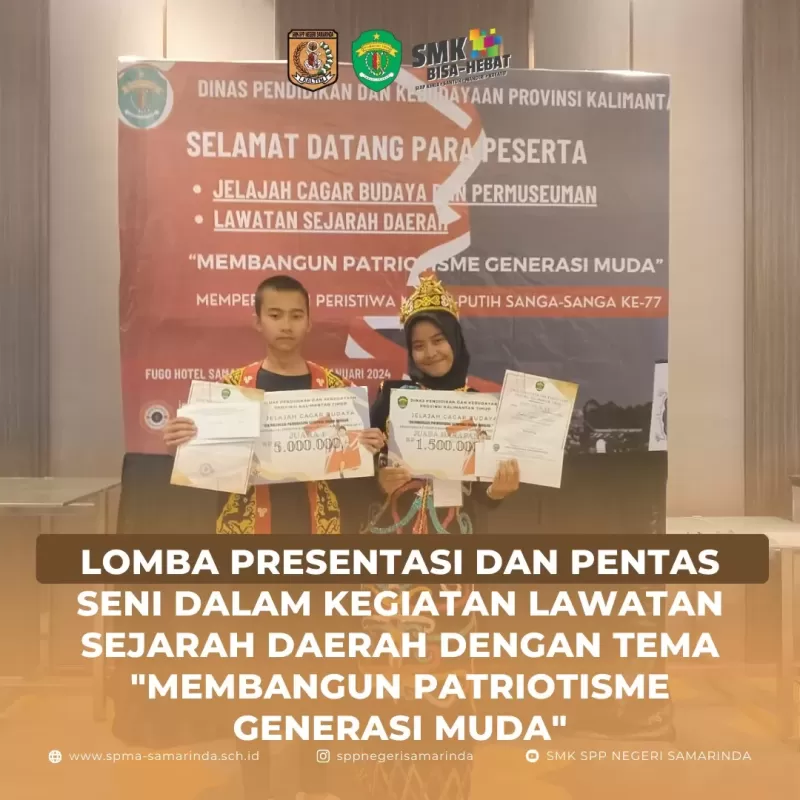 Selamat dan Sukses kepada Muhammad Noor Ilmi (X-A) juara 1 dan Yessica Ratna Ayudya N (X-C) juara harapan 3. Selamat atas capaiannya dalam lomba presentasi dan pentas seni! dalam kegiatan lawatan sejarah daerah dengan tema "Membangun Patriotisme Generasi Muda" di Sanga- Sanga. Semoga apa yang dicapai selama ini menjadi inspirasi bagi teman-teman sejawat sekolah SMK-SPP Negeri Samarinda