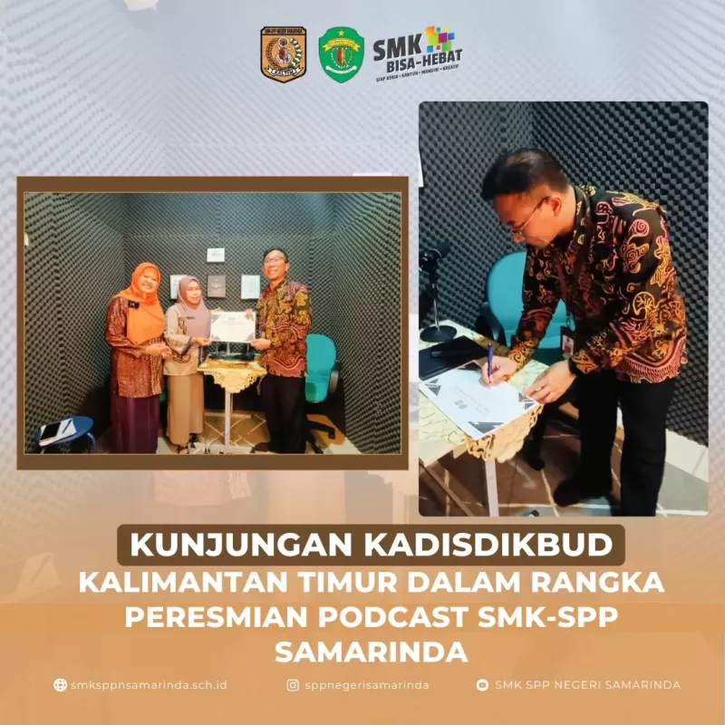 Kepala Dinas Pendidikan dan Kebudayaan Provinsi Kalimantan Timur, Bapak Muhammad Kurniawan, SE., Ak., MM. meresmikan ruang podcast SMK-SPP Negeri Samarinda ditandai dengan penandatanganan sertifikat.Â