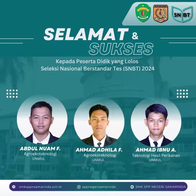 Selamat kepada peserta didik yang telah diterima di Perguruan Tinggi Universitas Mulawarman dan Politeknik Pertanian Negeri Samarinda melalui jalur Seleksi Nasional Berbasis Test (SNBT) tahun 2024. Semoga semakin sukses dijenjang berikutnya dan mencapai masa depan yang gemilang.