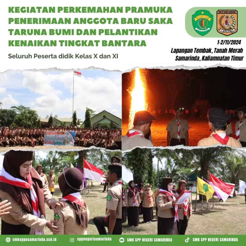 Hari kedua senam pagi dan bersih-bersih lingkungan sekitar, serta penerimaan anggota baru Saka Taruna Bumi dan Pelantikan kenaikan tingkat Bantara oleh ibu Elis Susiana, S.Pd.,M.Pd selaku kepala Sekolah SMK-SPP Negeri Samarinda serta diakhiri dengan foto bersama dan operasi semut.